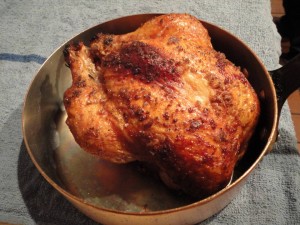 This recipe, which I developed for Le Pichet in 2000, is designed to produce a perfectly roasted, crispy skinned chicken in just under 1 hour.  Since the recipe is so simple with almost no added flavors to hide the great taste of the chicken, choose the best quality bird you can get your hands on.  Note that the high roasting temperature can result in a fair amount of smoke.  If you don’t have a hood or fan in your kitchen, this can be a problem.  I use grey salt or sel gris from Brittany for this recipe.