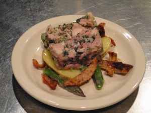 This terrine differs from the Burgundian classic Jambon Persillée in that it is made from fresh pork shanks instead of from smoked ham. The inclusion of soft herbs give it a lightness that contrasts with many other terrines.