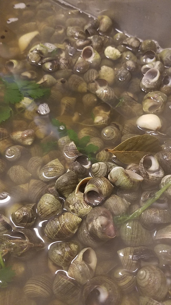 Getting ready for tomorrow’s Quarterly Chef’s Dinner at Café Presse includes preparing periwinnkes. Know as bigorneaux in France, small sea snails are poached then picked straight from the shell using a pin and dunked in mayonnaise. Accompanied by a glass of pastis, preferable facing the Mediterranean. Ah, another time perhaps.