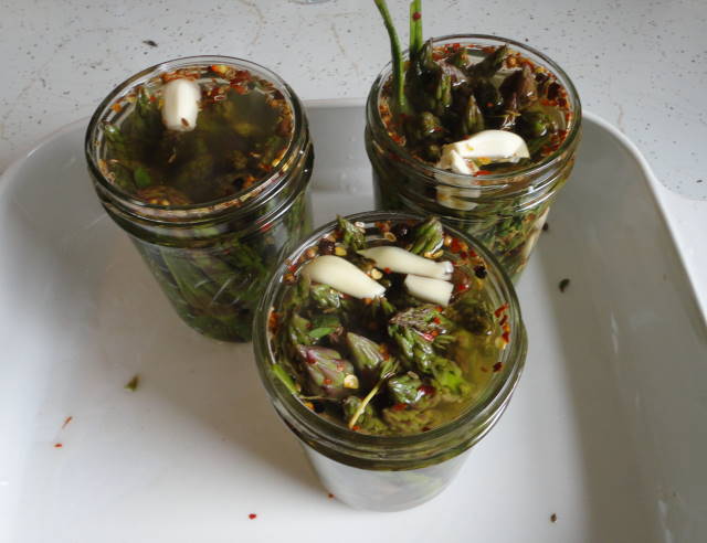When I make pickled asparagus, I like to blanch the spears first, then put them hot into pint jars, add the spices, garlic and a bit of dill, then fill the jars with hot brine and seal them quickly. The recommended method (by our friends in the USDA) for sealing jars is to boil the filled jars 12 minutes in water well over the height of the jar tops. Clearly, since the jars are to be boiled, you could put the asparagus into the cans raw, but in past efforts, it seems to me that a quick blanch before canning yields pickled asparagus with a firmer, more attractive texture. I like to can in pint jars, since I most often use pickled asparagus as part of a relish tray with drinks before dinner; a pint seems like just enough for one evening.