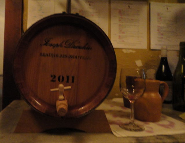 Last Thursday night, the third Thursday of November, Le Pichet marked the arrival of the first French wine of 2011 with our traditional Fete de Beajolais Nouveau. Beaujolais Nouveau is a wine made from gamay grapes harvested in the regions south of Lyon and vinified using a very short fermentation period, usually a few weeks. It is a typically a very light, fruity, vivacious wine not intended to be taken very seriously, but instead to be quaffed with pleasure and exuberance at celebrations that are the moral equivalent of other harvest festivals like Munich’s Octoberfest.