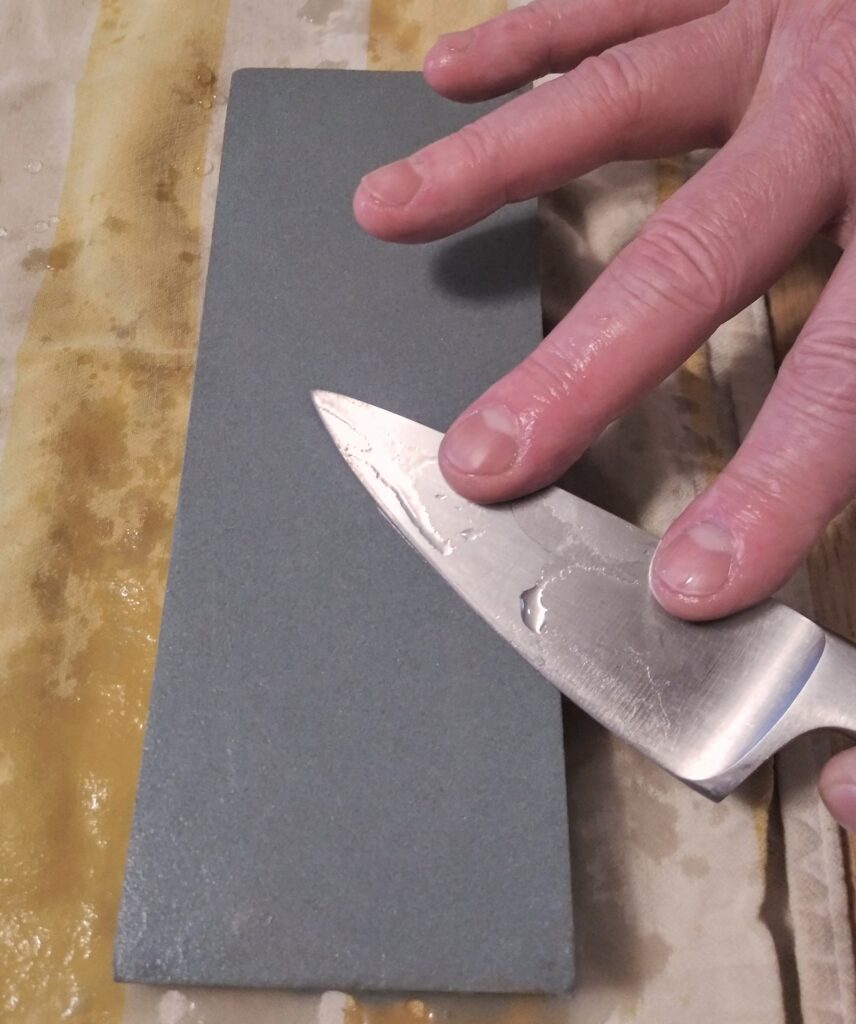 Although the knives I use are not necessarily expensive, they are well made and have been with me for a lot of years so I have developed a functional and sentimental attachment to them. For this reason, I choose to sharpen them myself using a whetstone. Whetstones are basically manual sharpening devices that you run the knife over repeatedly to make the cutting edge sharp. They come in different grits from fairly rough for initial shaping of the edge to finer grits for finishing. The manufacturer of the whetstones I use recommends soaking them in water before use. This type of whetstone is often referred to as a water stone. Whetstones also exist that need to be soaked with oil, or that don’t require any soaking, so be sure to read the instructions on whatever whetstones you purchase.