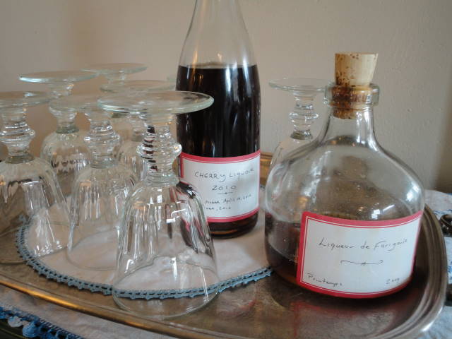 I began to research the other sorts of macerated wines that are traditionally made in France and found that the possibilities are nearly endless.  Liqueurs flavored with the blossoms of flowers, flowering trees and fruit trees, spices, roots, fruits, nuts are all made in different parts of France and at different times of the year.  Several years ago I conducted  some very rudimentary attempts at making my own macerated alcohols with mixed results.  A mixture of vodka flavored with orange and spices, then mixed with white wine and sugar was a light and refreshing summer aperitif served over ice.   Red wine flavored with walnut leaves and crushed green walnuts then fortified with vodka and sugar had an amazingly toasty walnut flavor; unfortunately, after I bottled and corked it, a secondary fermentation took place, causing the wine to become distinctly fizzy and to blow out its corks all over my wine cellar.  Good while it lasted, though.  The fizz sort of added to the fun, until it popped.