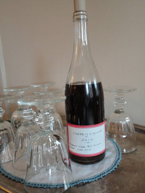 In 2010, the cherry tree was in full bloom during the 3rd week of April.  A friend and I hand picked the blossoms and carefully removed all leaves, large stems and spent flowers.  These were then macerated in a liter of good vodka (Ketel One) for about 2 months.  Note that this time I took precautions to make sure all the blossoms were completely. submerged in the vodka.  At the end of 2 months, the alcohol had taken on a color almost like sherry and had a distinct floral cherry smell.  I strained out the blossoms, added sugar syrup, placed the liqueur in a bottle and let mature until the fall.  By October 2010, the liqueur had lost the sharp alcohol smell and was ready for sipping.  The complete recipe is available on the recipe page.