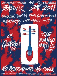 Every July 14, we celebrate Bastille Day with a Cafe-style party that really blows the doors off. We take out most of the chairs and tables, roll in wine barrels for party-goers to stand around and fire up the live music. The regular menu is out and in its place is a menu of Paris street food, made to be eaten while standing. Happily, every year the room is packed to bursting and the party unfolds in a true “ambiance de fou”. It is not like any other night of the year at Le Pichet, except maybe for our Fete de Beaujolais Nouveau, which comes around the third Thursday of November every year.
