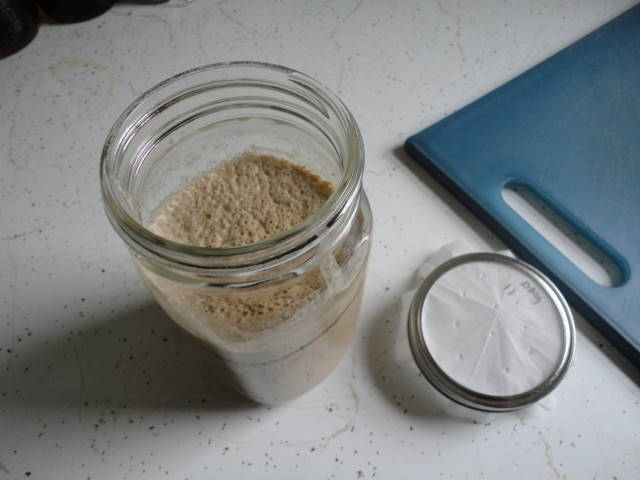 2. Day 2:  Add 1/2 cup rye flour to the starter, then add warm water to return to a soupy consistency.  Re-cover with cheesecloth and rubber band. Leave for 24 hours.