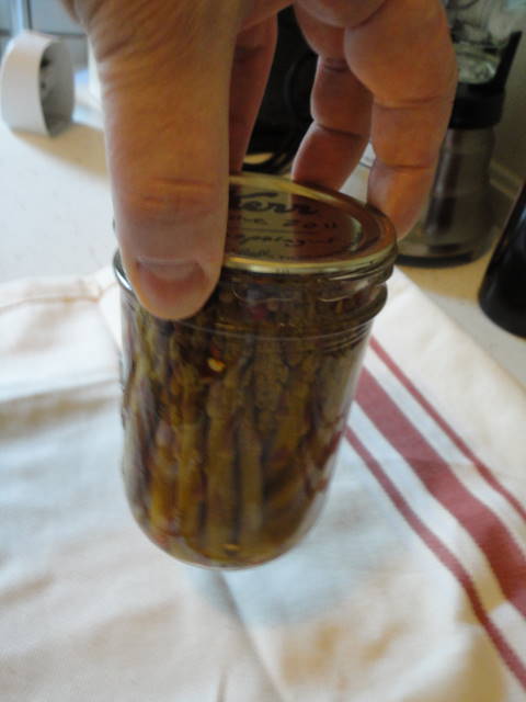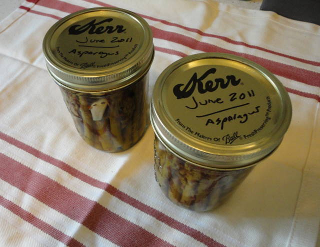 When I make pickled asparagus, I like to blanch the spears first, then put them hot into pint jars, add the spices, garlic and a bit of dill, then fill the jars with hot brine and seal them quickly. The recommended method (by our friends in the USDA) for sealing jars is to boil the filled jars 12 minutes in water well over the height of the jar tops. Clearly, since the jars are to be boiled, you could put the asparagus into the cans raw, but in past efforts, it seems to me that a quick blanch before canning yields pickled asparagus with a firmer, more attractive texture. I like to can in pint jars, since I most often use pickled asparagus as part of a relish tray with drinks before dinner; a pint seems like just enough for one evening.