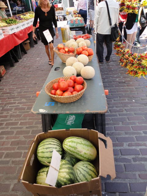 Although the farm tables have been full since early July, the peak of the harvest season has now begun in earnest. On this first weekend of September, the tables in the Market are fairly groaning under the weight of an ever growing selection. Melons, figs, tomatoes, cucumbers and peppers are just beginning to arrive, while favorites from earlier in the season, like lettuces, greens and radishes, are making a second, late season showing.