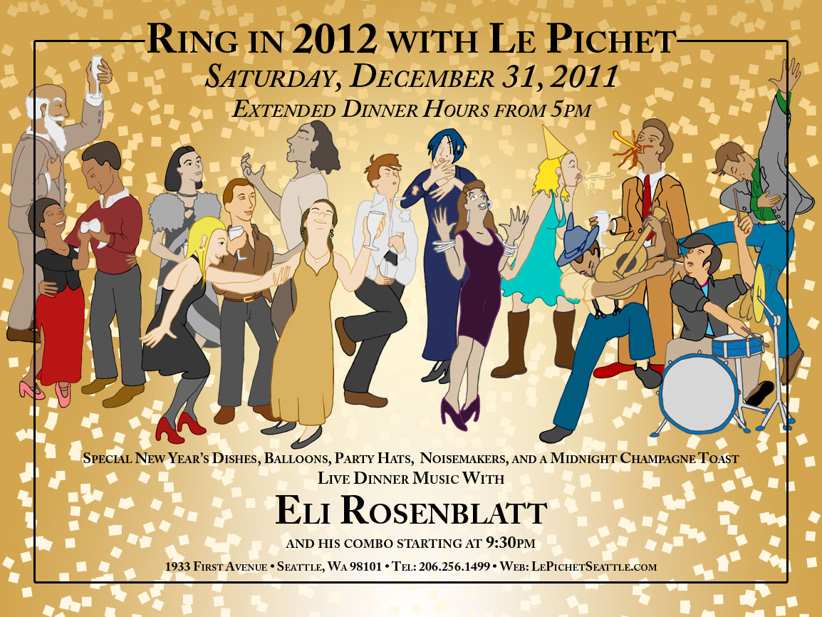 Le Pichet will be ringing in 2012 with extended dinner hours beginning at 5pm, festive party favors, hats, balloons, confetti and noisemakers and a Champagne toast at midnight. Wine director Joanne Herron has selected a special list of sparkling wines and Champagnes to accompany your festivities. In addition to our regular menu, we will be offering daily specials that feature foods that the French love to eat on New Year’s Eve; the details are under wraps for now, but think lobster and foie gras as well as festive desserts to finish the evening. Dinner music will be provided by Eli Rosenblatt and his combo beginning at 9:30pm.