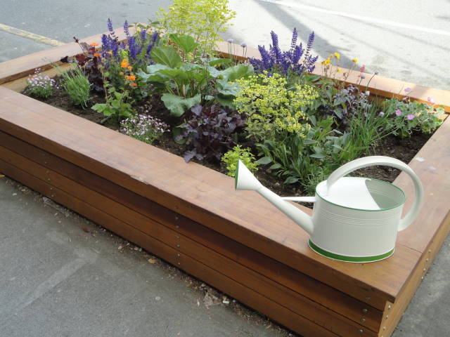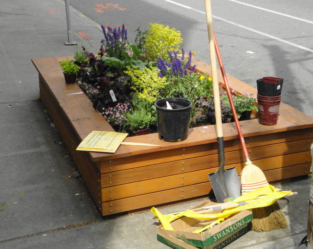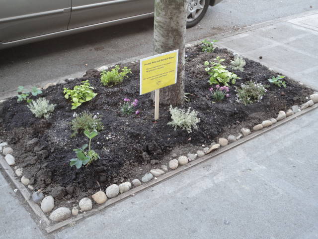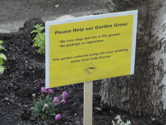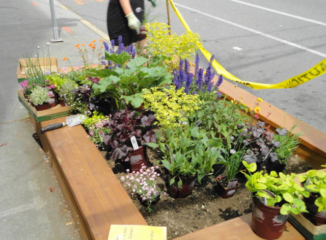 That is to say, most of the plants. After arranging the plants in the two garden spaces, it was clear that the space around our tree will require more plants in order to look as full and lush as we would like. But its a start, and the positive response from guests of Cafe Presse, our neighbors and just people passing by has been very gratifying. And most importantly to our goal of giving unofficial support to the Pollinator Pathway Project, the bees have already begun to move in. The salvia seems particularly popular.