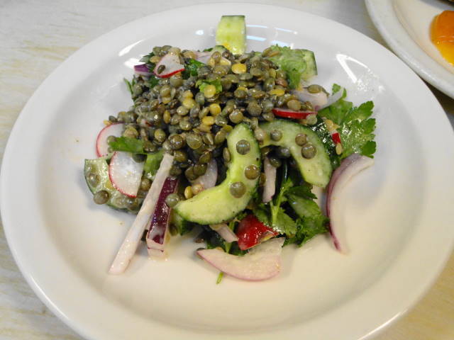 Green lentil “tabouli” with mint, radishes, cucumber, red onion, golden raisins, cilantro, parsley and tahini vinaigrette.