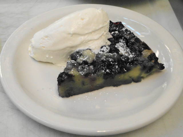 Summer berry clafoutis (this is blueberry) served warm with whipped cream.