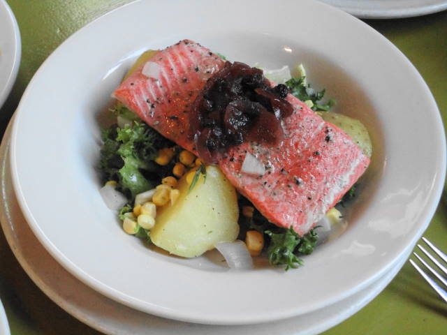Poached wild sockeye salmon on a warm salad of Yukon potatoes, curly endive, sweet corn and summer savory, with a sweet onion and black currant compote.