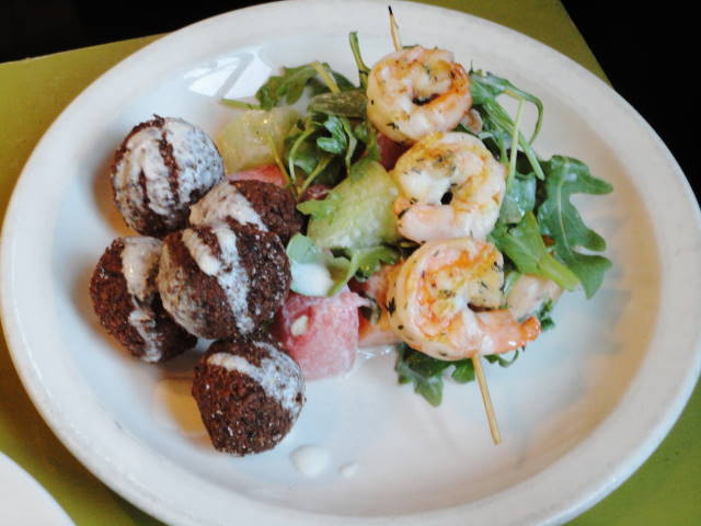 Falafel served with a salad of arugula, summer melon, mint, honeyed yogurt and grilled wild gulf prawns.