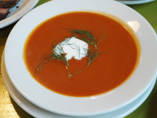 Tomato-lemon-sweet garlic soup with dill creme fraiche.