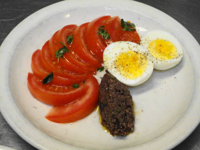Yakima tomatoes with fresh oregano, tapenade and hard cooked egg.