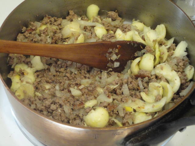 I have made stuffed winter squashes before with a fair amount of success (meaning that my wife agrees to eat my stuffed winter squash and says she likes them). So on a recent weeknight, I decided to try my hand at stuffed summer squash with the help of a pound of ground pork from Olsen Farms. Off the bat, it seems to me that there would be 2 major differences in cooking the summer and winter types : 1) unlike harder winter squashes, summer squashed do not need to be par cooked 2) In fact, since you dont want summer squashes to be cooked to mush, the filling should be fully cooked before stuffing so that it only needs to be heated through along with the squash.