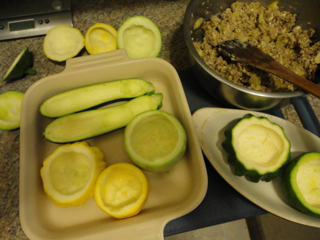 For roundish squashes, I find that it is best to cut a lid and then hollow them out like a pumpkin. With long, thin squashes, I cut them in half the long way and then hollow out a long trench for the filling.