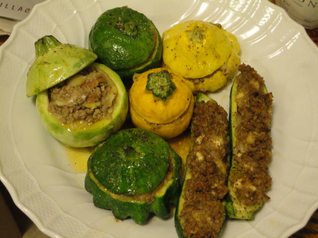 This summer, while reading French culinary magazines, I was reminded that stuffed summer squashes are a popular dish throughout the south of France (a region thankfully free of zucchini bread…are the two facts related?). In Nice, for example, the name Petite farci Nicoise describes a dish of assorted stuffed vegetables, including squashes, eggplants, onions, sweet peppers and artichokes, baked with a stuffing of ground meat and bread crumbs. In Provence, Legumes farci a la Provencal are vegetables stuffed principally with rice and salt pork, although the recipe can also include cheese, herbs, onions, garlic and other ingredients, depending on the cook and the local customs.