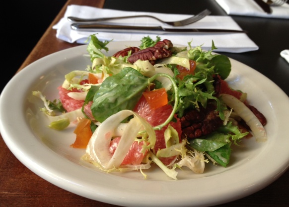 “Salad of Belgian endive, frisée and curly endive, with grapefruit suprêmes, candied grapefruit peel and toasted pecans”