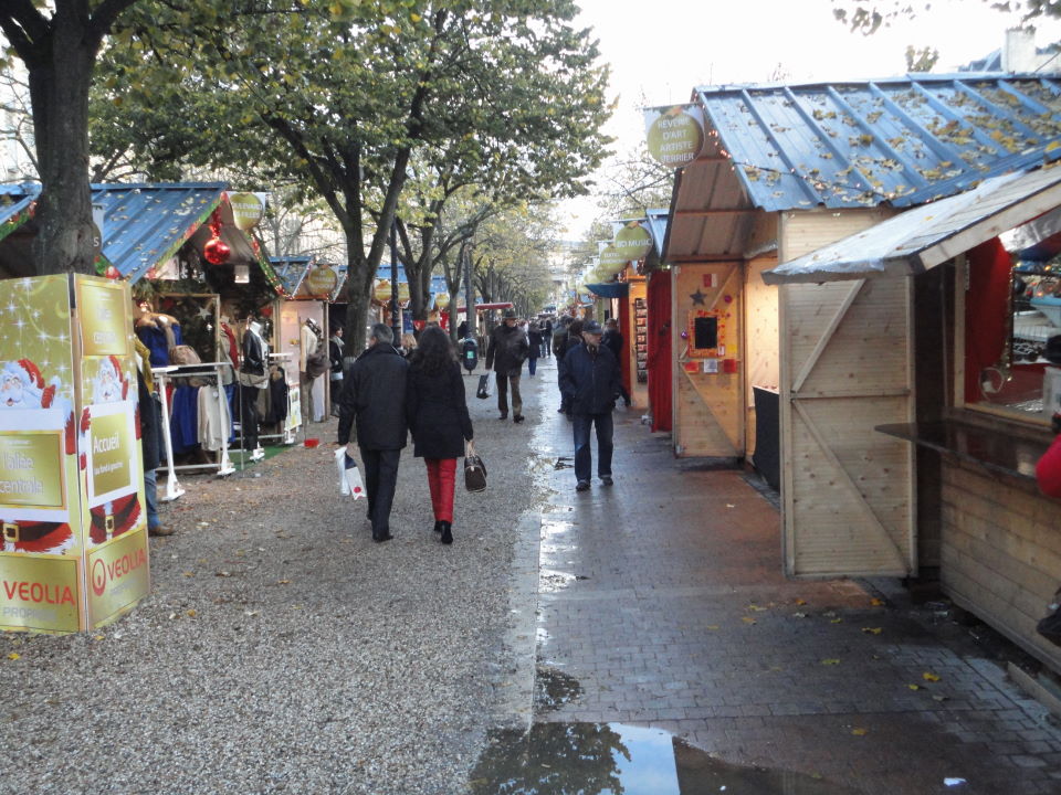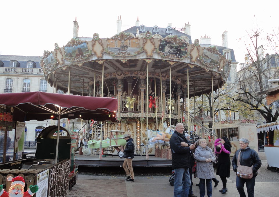 Best of all, from my point of view, the Marche de Noël is very food-centric, no surprise in France. Stands representing regional specialties (Basque sausages and seafood stews; Alsatian sauerkraut; Aligot from Auvergne) share space with venders roasting chestnuts and stool-lined counters selling hot mulled wine and cider. Other stands offer crepes, chipolata sandwiches, waffles, wine and champagne tasting, foie gras baguettes and canelés, the crown shaped caramelized cakes that are one of the best known specialties of Bordeaux. The entire Marché is ringed by beer and wine gardens that fill up with people escaping from work early, just as twilight falls over the city and the Holiday lights are lit.