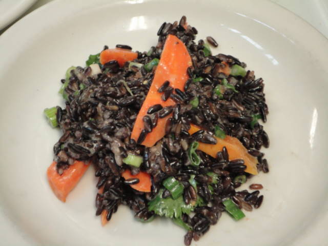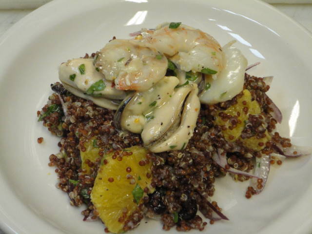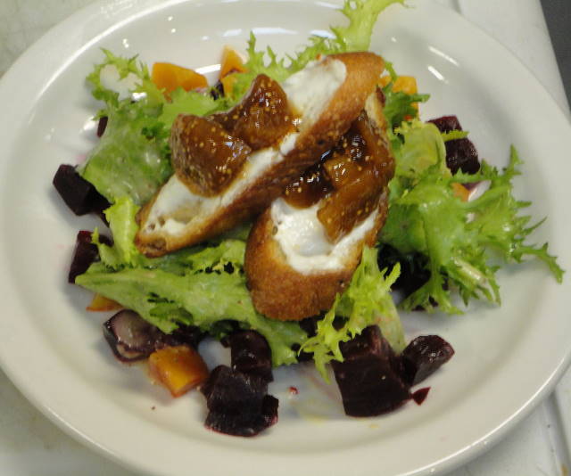 Warm goat cheese and fig croustades served on a salad of curly endive and red and gold beets.Marinated prawns and mussels served on a salad of red quinoa, oranges, red onion, avocado and oil cured olivesNew with roasted cold half chicken, a salad of black rice, roasted carrots, green onions, and cumin vinaigrette.