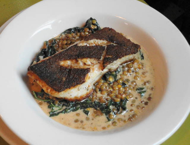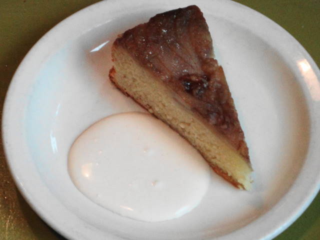 Rillons: crispy confit pork belly served with prune mustard and cornichons.Ling cod pan roasted on the skin, served on brown-butter and garlic creamy lentils and wilted kale.Northwest Grass Fed New York strip steak served with pommes frites and a creamy mushroom-caper-tarragon sauce.Caramelized rice cake with vanilla poached pineapple and fresh cream.Pear and Walnut upside down cake, served warm with cinnamon creme fraiche.Chocolate-coconut torte with warm caramel sauce.