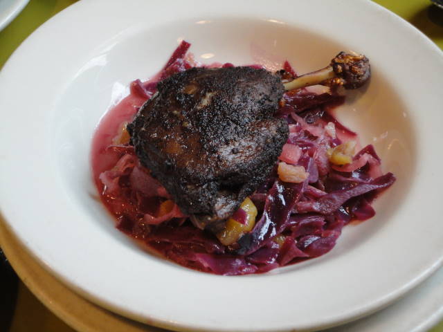 Confit muscovy duck leg served on a bed of red cabbage, apples, chestnuts and sauerkraut.