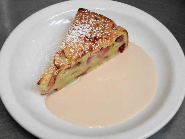 Warm rhubarb-vanilla cake served with walnut creme anglais.
