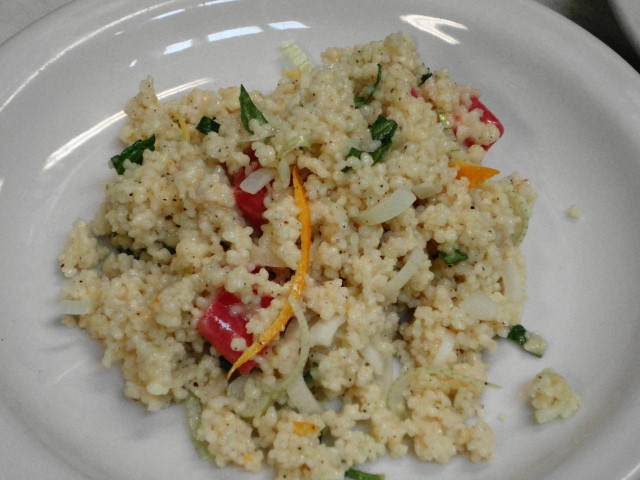 This is the salad served with the cold roasted half Washington natural chicken: Citrus couscous, candied rhubarb, spring onions and mint with a rhubarb vinaigrette.