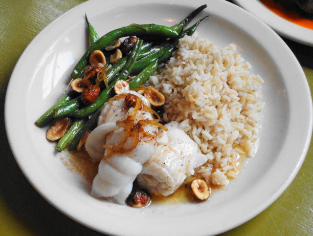 The new Spring menu at Cafe Presse features steamed Dover sole served with brown rice, sauteed green beans and a brown butter sauce with lemon, candied lemon peel and hazelnuts.