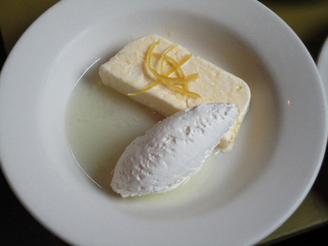 Frozen lemon mousse with candies lemon peel, lemon syrop and whipped cream.