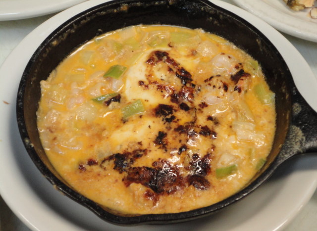 Poelon breton…two eggs broiled in a skillet with wild caught gulf prawns, bay scallops, leeks and lobster cream.