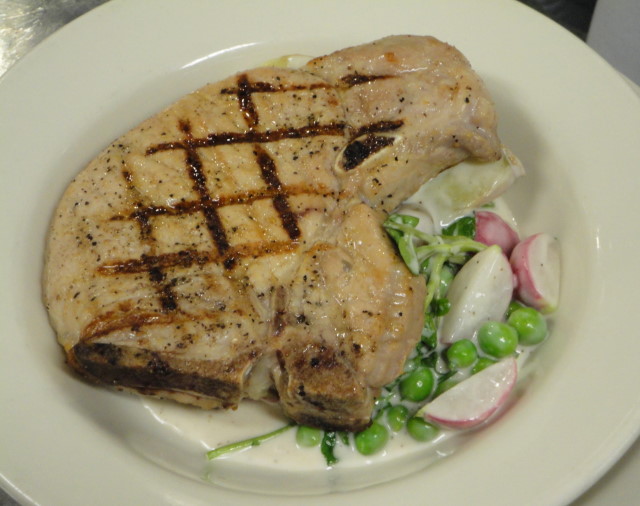 House smoked Carlton natural pork chop, grilled and served on radishes, peas, fingerling potatoes and watercress simmered in taleggio cream sauce.