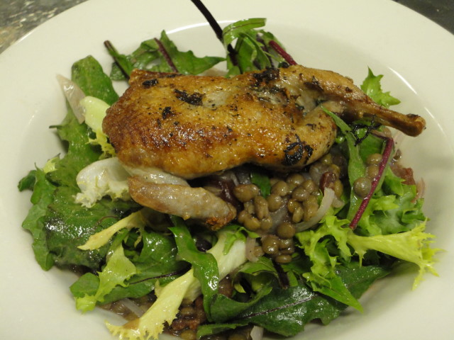 Pan roasted quail served on a warm salad of curly endive and dandelion greens and green lentils tossed with a warm shallot-bacon vinaigrette.