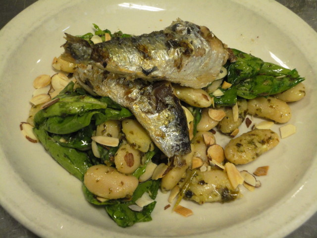 Grilled Spanish sardines on a warm salad of white beans, almonds and wilted arugula tossed with a spring herb pistou.