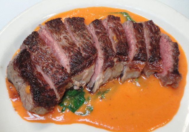 Pan roasted NW Grassfed petit New York steak served with a roasted red pepper-spinach coulis and pommes frites.