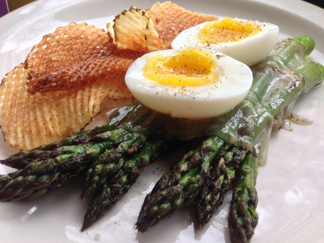 Washington State asparagus broiled with lemon-garlic oil, thinly sliced Iberico lardo, soft cooked egg and crispy waffle cut potatoes.