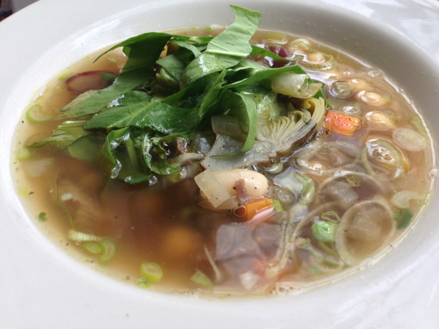 Spring lamb soup with lamb broth and shank, white and kidney beans and spring herb pistou butter.