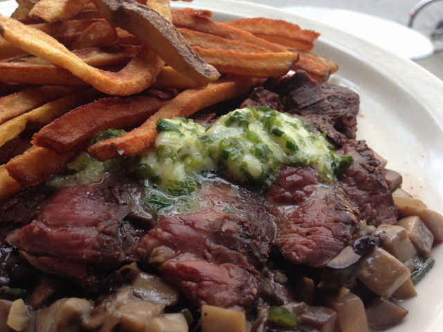 Grilled Northwest Grass Fed beef skirt steak, wild ramp butter, rustic mushroom duxelles and pommes frites