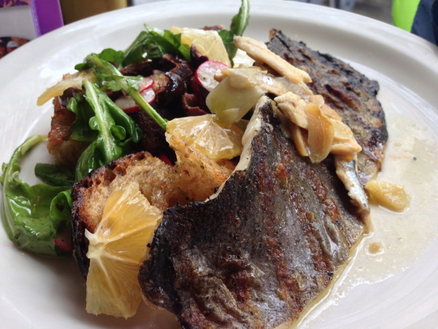 Trout filet grilled on the skin on a salad of grilled bread, arugula, Meyer lemon, Nicoise olives and garlic-white anchovy bagna cauda