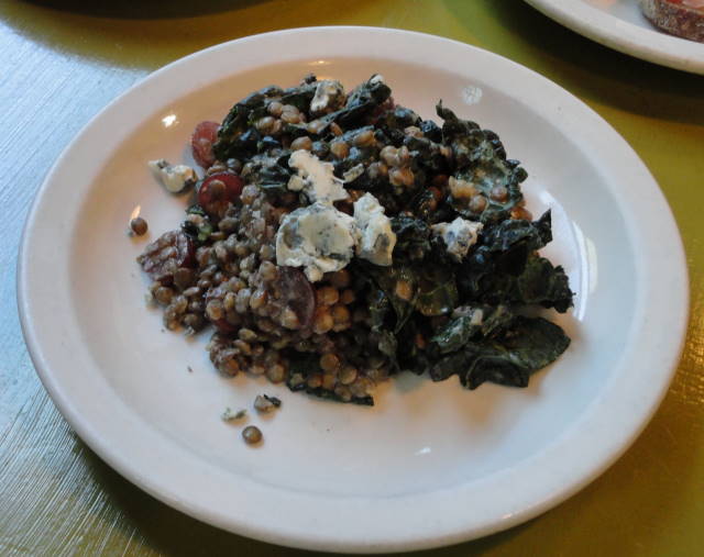 New salad with our cold half chicken:  Marinated French lentils tossed with wilted kale, red grapes and cow's milk bleu cheese.