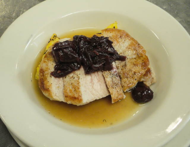 Spice brined Carlton pork loin served with grilled green onion-sheep cheese polenta, a rich pork broth and Bing cherry-caramelized onion compote.