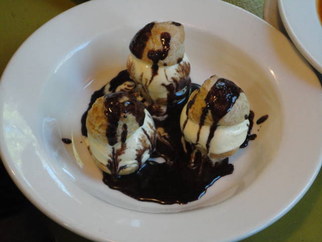 Classic proferoles with vanilla ice cream and warm chocolate sauce.