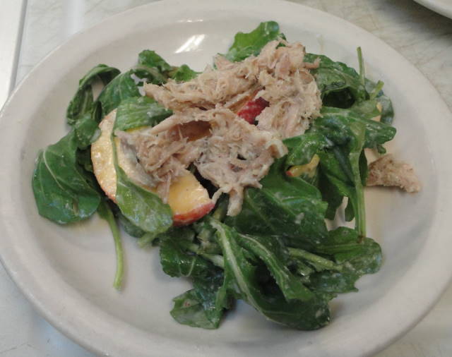 Washington rabbit confit on a salad of arugula, stone fruit, picholine olive and almond vinaigrette