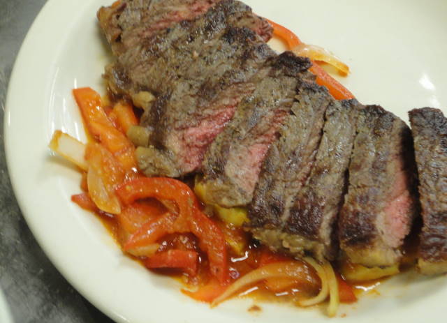 Grass fed petite New York steak on a saute of peppers, fennel, nicoise olive and tomato, served with pommes frites