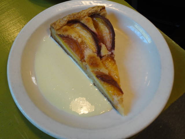 Stone fruit tart “bordelaise” with almond cream, served with anise hyssop creme anglaise.