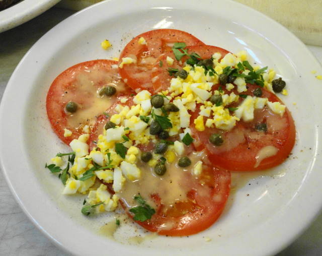Local tomatoes “mimosa” with chopped egg, capers, parsley and anchovy vinaigrette.