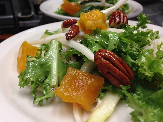 Salad of curly and Belgian endives, tossed with pecans, candied pumpkin and sherry vinegar.