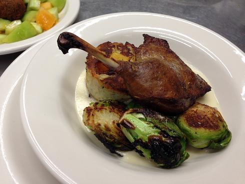 Oven roasted muscovy duck leg confit, served with winter squash-sage bread pudding, apple-calvodos butter and roasted Brussels sprouts.
